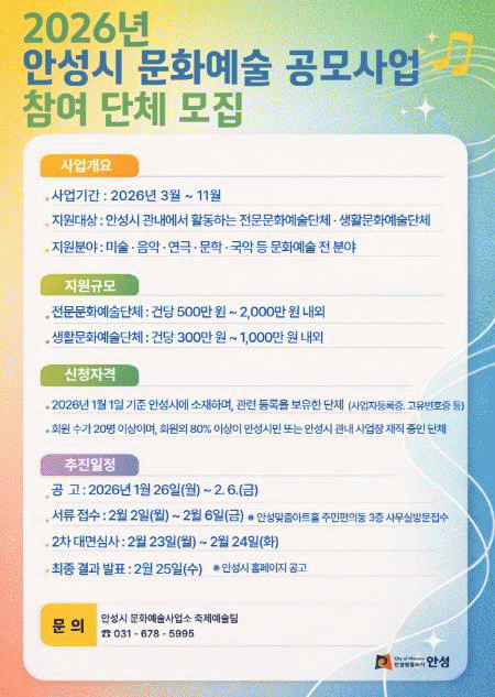 [NWS¹æ¼Û=Çѽ¸ñ ±âÀÚ]¾È¼º½Ã´Â Áö¿ª ¹®È­¿¹¼ú Ȱ¼ºÈ­¸¦ À§ÇØ 2026³â ¹®È­¿¹¼ú º¸Á¶±Ý Áö¿ø °ø¸ð»ç¾÷ Âü¿© ´Üü¸¦ °ø°³ ¸ðÁýÇÑ´Ù°í ¹àÇû´Ù.