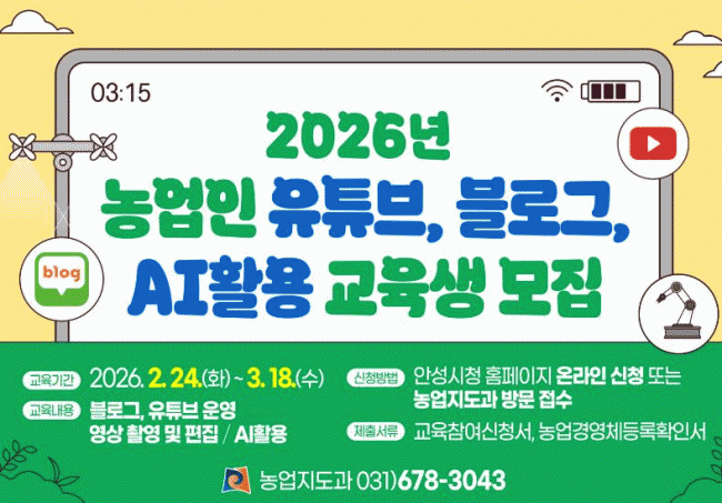 | ¾È¼º½Ã³ó¾÷±â¼ú¼¾ÅÍ, 2026³â ³ó¾÷ÀÎ À¯Æ©ºê¡¤ºí·Î±×¡¤AIȰ¿ë ±³À°»ý ¸ðÁý =Çѽ¸ñ ±âÀÚ |