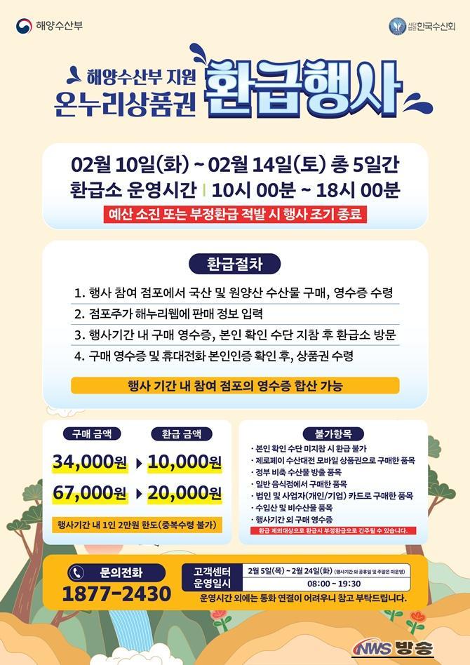 À̹ø ȯ±Þ Çà»ç´Â ¿À´Â 2¿ù 10ÀÏ(È­)ºÎÅÍ 2¿ù 14ÀÏ(Åä)±îÁö 5Àϰ£, ¸ÅÀÏ 10½ÃºÎÅÍ 18½Ã±îÁö ÁøÇàµÇ¸ç, Çà»ç ±â°£ ³» µµ¸Å½ÃÀå Âü¿© Á¡Æ÷¿¡¼­ ±¹³»»ê ¼ö»ê¹°À» ±¸¸ÅÇÑ °í°´À» ´ë»óÀ¸·Î ±¸¸Å±Ý¾×ÀÇ ÃÖ´ë 30%¸¦ ¿Â´©¸®»óǰ±ÇÀ¸·Î ȯ±ÞÇØ ÁØ´Ù. ȯ±Þ Çѵµ´Â 1Àδç ÃÖ´ë 2¸¸ ¿øÀÌ´Ù.
