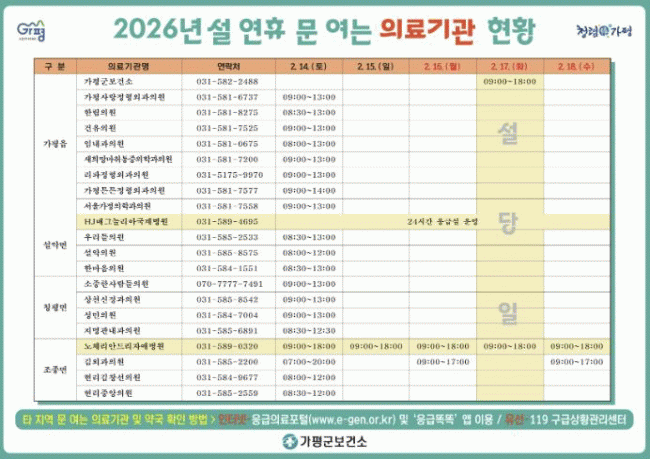 ¾Æ¿ï·¯ °¡Æò±ºÀº ¼³ ¿¬ÈÞ µ¿¾È ¿î¿µÇÏ´Â ÀÇ·á±â°ü, ¾à±¹ Á¤º¸¸¦ »çÀü¿¡ ¾È³»Çϰí ÀÖ´Ù. ¿¬ÈÞ ±â°£ ¹®À» ¿©´Â ÀÇ·á±â°ü ¹× ¾à±¹ Á¤º¸´Â ¡â°¡Æò±ºÃ» ¹× °¡Æò±ºº¸°Ç¼Ò ȨÆäÀÌÁö ¡â119±¸±Þ»óȲ°ü¸®¼¾ÅÍ ¡âÀÀ±ÞÀÇ·áÆ÷ÅÐ ¡âº¸°Çº¹ÁöÄݼ¾ÅÍ¿¡¼ È®ÀÎÇÒ ¼ö ÀÖ´Ù.