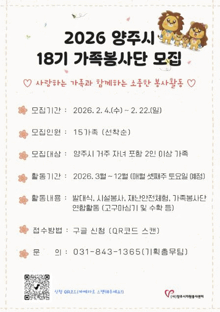 [NWS¹æ¼Û=Çѽ¸ñ ±âÀÚ]¾çÁÖ½ÃÀÚ¿øºÀ»ç¼¾ÅÍ´Â °¡Á·ÀÌ ÇÔ²² Âü¿©ÇÏ´Â ÀÚ¿øºÀ»ç Ȱµ¿À» ÅëÇØ °Ç°ÇÑ °¡Á·¹®È¸¦ Á¶¼ºÇϰí Áö¿ª»çȸ ³ª´®À» ½ÇõÇϱâ À§ÇØ °¡Á· ´ÜÀ§·Î ÇÔ²² Âü¿©ÇÏ´Â ¡®18±â °¡Á·ºÀ»ç´Ü¡¯À» ¸ðÁýÇÑ´Ù°í ¹àÇû´Ù.