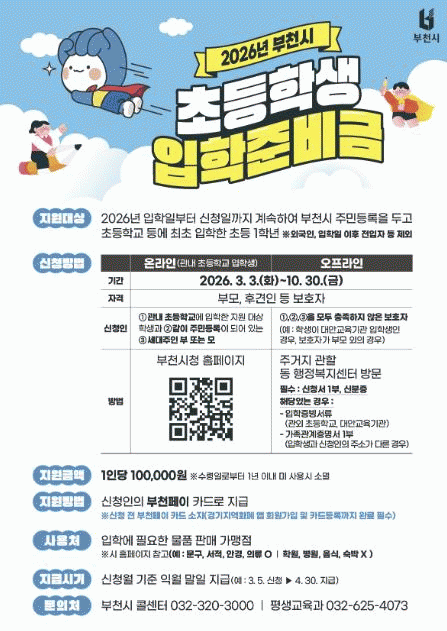 [NWS¹æ¼Û=Çѽ¸ñ ±âÀÚ]ºÎõ½Ã´Â 2026Çг⵵ ÃʵîÇб³ ÀÔÇлýÀÇ »õ·Î¿î Ãâ¹ßÀ» ÀÀ¿øÇϰí, ÇкθðÀÇ °æÁ¦Àû ºÎ´ãÀ» ´ú±â À§ÇØ ÃʵîÇб³ ÀÔÇÐÁغñ±Ý Áö¿ø »ç¾÷À» ÃßÁøÇÑ´Ù.