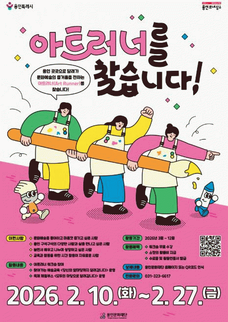 [NWS¹æ¼Û=Çѽ¸ñ ±âÀÚ]¿ëÀι®È­Àç´ÜÀº ¿ëÀνùΠ3¸í ÀÌ»ó ¸ðÀÎ °÷À̶ó¸é ¾îµðµç ¿¹¼ú±³À°À» ¸Å°³·Î ½Ã¹Î°ú ÀÏ»óÀ» ÀÕ´Â ¹®È­ ¸Å°³ÀÚ ¡®¾ÆÆ®·¯³Ê(Art Runner)¡¯¸¦ ¿À´Â 27ÀϱîÁö ¸ðÁýÇÑ´Ù.