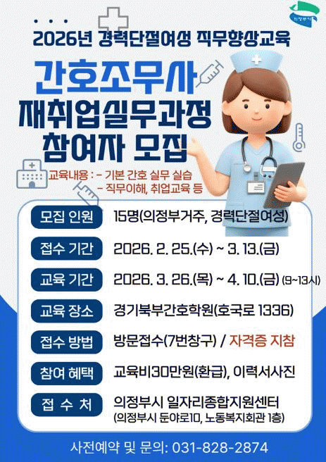 [NWS¹æ¼Û=Çѽ¸ñ ±âÀÚ]ÀÇÁ¤ºÎ½Ã´Â °ü³» °æ·Â´ÜÀý¿©¼º ±¸Á÷ÀÚ¸¦ À§ÇÑ ¸ÂÃãÇü Á÷¾÷±³À°À¸·Î ¡®°£È£Á¶¹«»ç ÀçÃë¾÷ ½Ç¹«°úÁ¤¡¯ Âü¿©ÀÚ¸¦ ¸ðÁýÇÑ´Ù.