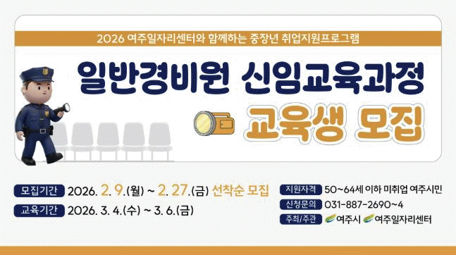 [NWS¹æ¼Û=Çѽ¸ñ ±âÀÚ]¿©Áֽô ÁßÀå³âÃþÀÇ ÀçÃë¾÷À» µ½±â À§ÇØ 2026³â ¿©Áֽà ÁßÀå³â ÀϹݰæºñ¿ø ½ÅÀÓ±³À°°úÁ¤ ±³À°»ýÀ» ¸ðÁýÇÑ´Ù°í ¹àÇû´Ù.