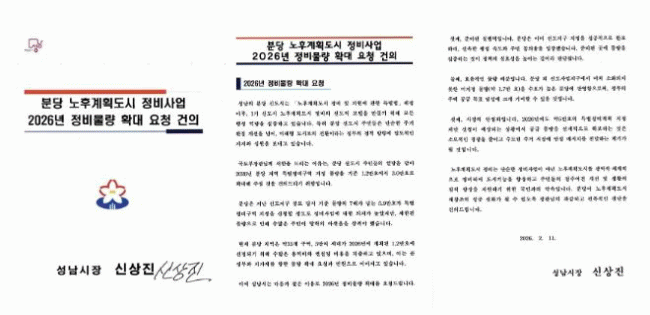 ½Ã´Â 11ÀÏ ½Å»óÁø ¼º³²½ÃÀå ¸íÀÇ·Î ±¹Åä±³ÅëºÎ Àå°ü¿¡°Ô º¸³½ ¼­ÇÑÀ» ÅëÇØ ¡°ºÐ´ç ½Åµµ½Ã ÁֹεéÀº ¹Ì·¡Çü µµ½Ã·ÎÀÇ ÀüȯÀ̶ó´Â Á¤ºÎ Á¤Ã¥ ¹æÇâ¿¡ ´ëÇØ ÁöÁö¿Í Âü¿© ÀÇÁö¸¦ º¸¿©ÁÖ°í ÀÖ´Ù¡±¸ç ¡°ÀÌ·¯ÇÑ ÁֹεéÀÇ ³ôÀº Á¤ºñ ÀÇÁö¿Í ¿­¸ÁÀ» ´ã¾Æ 2026³â Ưº°Á¤ºñ±¸¿ª ÁöÁ¤ ¹°·®ÀÇ °ú°¨ÇÑ È®´ë¸¦ ¿äûÇÑ´Ù¡±°í ¹àÇû´Ù.