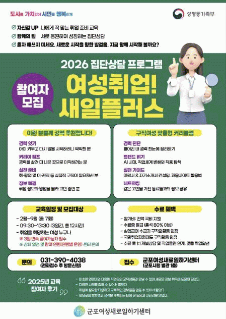 | ±ºÆ÷½Ã ¿©¼º»õ·ÎÀÏÇϱ⼾ÅÍ, 2026³â Áý´Ü»ó´ãÇÁ·Î±×·¥ Âü¿©ÀÚ ¸ðÁý °æ·Â´ÜÀý ¿¹¹æºÎÅÍ ½ÇÀü ±¸Á÷±îÁö, ¸ÂÃãÇü Ä¿¸®Å§·³À¸·Î ¿©¼º °æÁ¦È°µ¿ Áö¿ø =Çѽ¸ñ ±âÀÚ |