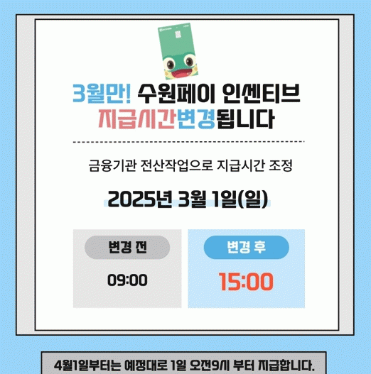 ¼ö¿øÆäÀÌ Àμ¾Æ¼ºê Áö±Þ ½ÃÀÛ ½Ã°¢Àº ¸Å´Þ 1ÀÏ ¿ÀÀü 9½Ã¿´Áö¸¸, 3¿ù 1ÀÏ ±ÝÀ¶±â°ü Àü»ê ÀÛ¾÷À¸·Î ÀÎÇØ ¿ÀÈÄ 3½Ã·Î ´ÊÃçÁø´Ù. 4¿ùºÎÅÍ´Â ´Ù½Ã 1ÀÏ ¿ÀÀü 9½ÃºÎÅÍ Áö±ÞÇÑ´Ù.