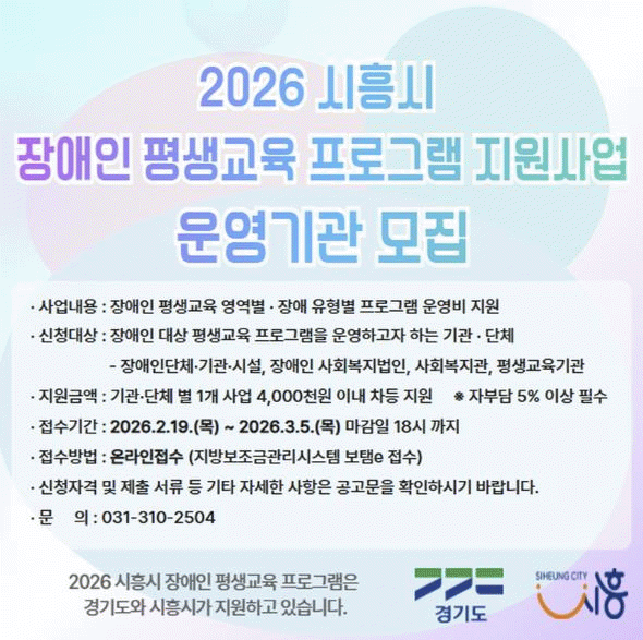 [NWS¹æ¼Û=Çѽ¸ñ ±âÀÚ]½ÃÈï½Ã´Â Àå¾ÖÀÎÀÇ ÇнÀ±ÇÀ» º¸ÀåÇÏ°í »çȸÂü¿© ±âȸ¸¦ È®´ëÇϱâ À§ÇØ ¡®2026³â Àå¾ÖÀÎ Æò»ý±³À° ÇÁ·Î±×·¥ Áö¿ø»ç¾÷¡¯À» ÃßÁøÇÏ´Â °¡¿îµ¥ ¿î¿µ±â°üÀ» ¸ðÁýÇÑ´Ù.