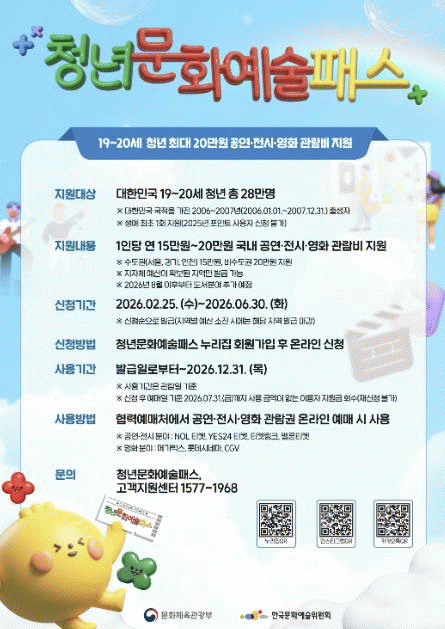 ¡®Ã»³â¹®È¿¹¼úÆÐ½º¡¯´Â 19~20¼¼ û³âÀ» ´ë»óÀ¸·Î ¼Òµæ°ú °ü°è¾øÀÌ °ø¿¬¡¤Àü½Ã¡¤¿µÈ °ü¶÷ºñ¸¦ 1Àδç ÃÖ´ë 15¸¸ ¿ø±îÁö Áö¿øÇÏ´Â ¹®Èº¹Áö »ç¾÷À¸·Î, ¹®ÈüÀ°°ü±¤ºÎ¿Í Çѱ¹¹®È¿¹¼úÀ§¿øÈ¸°¡ ÁÖ°üÇÑ´Ù.