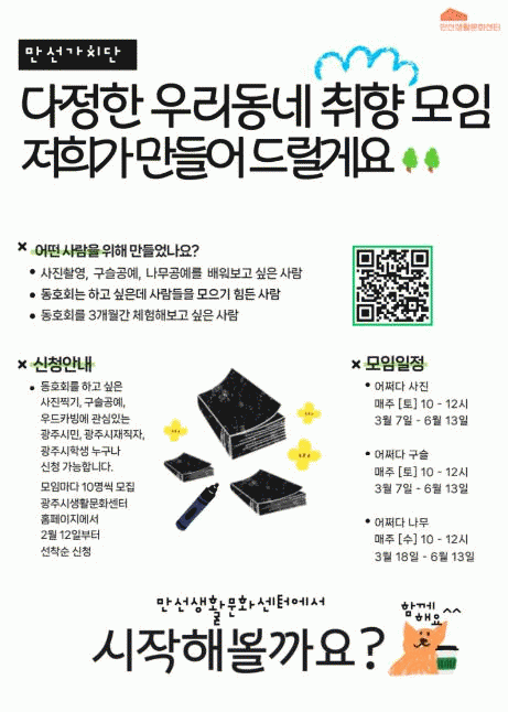 [NWS¹æ¼Û=Çѽ¸ñ ±âÀÚ](Àç)±¤Áֽù®ÈÀç´Ü ¸¸¼±»ýȰ¹®È¼¾ÅͰ¡ ±¤ÁֽùÎÀÇ »ýȰ¹®È Ȱµ¿ ±â¹ÝÀ» È®´ëÇϰí ÀÚ¹ßÀûÀÎ µ¿È£È¸ Çü¼ºÀ» Áö¿øÇϱâ À§ÇØ 2026³â µ¿È£È¸ ¹ß±¼»ç¾÷ '¸¸¼±°¡Ä¡´Ü' 1±â Âü¿©ÀÚ¸¦ ¸ðÁýÇÑ´Ù.