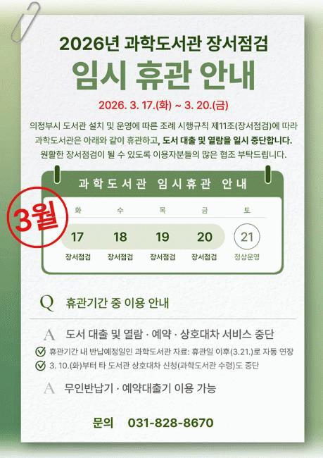 ÀÇÁ¤ºÎ°úÇеµ¼­°ü, 3¿ù 17~20ÀÏ Àå¼­ Á¡°ËÀ¸·Î Àӽà ÈÞ°ü