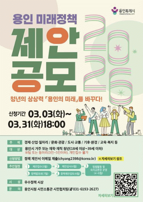 | ¿ëÀÎÆ¯·Ê½Ã, '2026³â ¿ëÀÎ ¹Ì·¡Á¤Ã¥ Á¦¾È °ø¸ðÀü' °³ÃÖ 3¿ù 3ÀϺÎÅÍ 31ÀϱîÁö Á¢¼ö¡¦Ã»³â¡¤Àü¹®°¡¡¤°øÁ÷ÀÚ Âü¿©ÇÏ´Â ¡®¼÷ÀÇ Åä·Ð¡¯À¸·Î Á¤Ã¥ ½ÇÇö¼º ³ô¿© =Çѽ¸ñ ±âÀÚ |