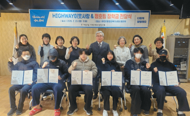 [NWS¹æ¼Û=Çѽ¸ñ ±âÀÚ]±¤¸í½Ã ÇϾÈ2µ¿ Áö¿ª»çȸº¸ÀåÇùÀÇü´Â 23ÀÏ ÇϾÈ2µ¿ ÇàÁ¤º¹Áö¼¾ÅÍ ´ë°´ç¿¡¼ ¡®2026³â ÇÏÀÌ¿þÀÌ(HIGHWAY) ÀÌ¿ô»ç¶û&Á¤È£¸² ÀåÇлý¡¯À¸·Î ¼±¹ßµÈ ´ëÇлý 6¸í¿¡°Ô ÃÑ 600¸¸ ¿øÀÇ ÀåÇбÝÀ» Àü´ÞÇß´Ù.