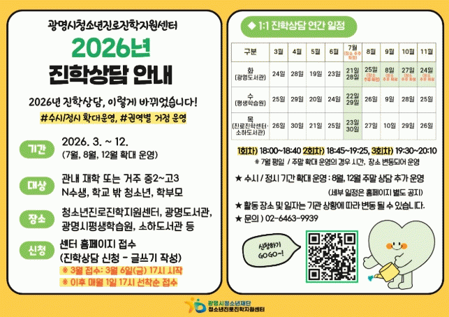 | ±¤¸í½Ãû¼Ò³âÁø·ÎÁøÇÐÁö¿ø¼¾ÅÍ, 2026³â 1:1 ÁøÇлó´ã ¿¬°£ ¿î¿µ º»°Ý ÃßÁø Áß2ºÎÅÍ N¼ö»ý±îÁö ¸ÂÃãÇü Àü·« Áö¿ø, Á÷ÀåÀÎ ºÎ¸ð À§ÇÑ ÁÖ¸» »ó´ãµµ ¿î¿µ =Çѽ¸ñ ±âÀÚ |