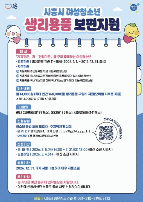 Áö¿ø ´ë»óÀº ½ÃÈï½Ã¿¡ Áֹεî·Ï ¶Ç´Â ¿Ü±¹ÀÎ µî·Ï¤ý±¹³»°Å¼Ò½Å°í°¡ µÅ ÀÖ´Â 11¼¼~18¼¼(2008³â 1¿ù 1ÀÏ~2015³â 12¿ù 31ÀÏ Ãâ»ý) ¿©¼ºÃ»¼Ò³âÀÌ´Ù. ´Ù¸¸, ¼ºÆòµî°¡Á·ºÎ ¿©¼ºÃ»¼Ò³â »ý¸®¿ëǰ ¹Ù¿ìó Áö¿ø ´ë»óÀÚ´Â Áߺ¹ ½ÅûÀÌ ºÒ°¡ÇÏ´Ù.