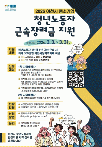 | ÀÌõ½Ã, 2026³â »ó¹Ý±â Áß¼Ò±â¾÷ û³â³ëµ¿ÀÚ ±Ù¼ÓÀå·Á±Ý Áö¿ø»ç¾÷ Âü¿©ÀÚ ¸ðÁý Áß¼Ò±â¾÷ û³â³ëµ¿ÀÚ 1Àδç ÃÖ´ë 300¸¸ ¿ø ÀÌõ»ç¶ûÁö¿ªÈÆó Áö±Þ =ÇãÀº¼ ±âÀÚ |