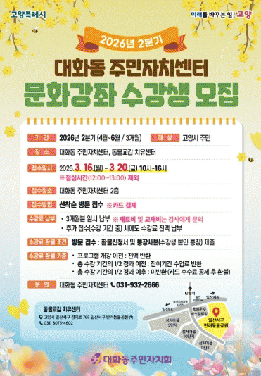 | °í¾ç½Ã ´ëȵ¿ ÁÖ¹ÎÀÚġȸ, 2026³â 2ºÐ±â ¹®È°Á ¼ö°»ý ¸ðÁý 3¿ù 16ÀÏ~20ÀÏ Á¢¼ö¡¦Ã¼À°, °Ç°, ¹®È, Ãë¹Ì, ¾îÇÐ ºÐ¾ß 31°³ ¿î¿µ =Çѽ¸ñ ±âÀÚ |