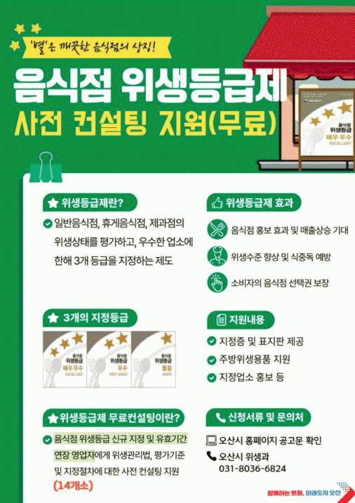 [NWS¹æ¼Û=Çѽ¸ñ ±âÀÚ]¿À»ê½Ã´Â °ü³» À½½ÄÁ¡ÀÇ À§»ý ¼öÁØ Çâ»ó°ú ¾ÈÀüÇÑ ¿Ü½Äȯ°æ Á¶¼ºÀ» À§ÇØ ¡®À½½ÄÁ¡ À§»ýµî±ÞÁ¦(½Äǰ¾È½É¾÷¼Ò) »çÀü ÄÁ¼³ÆÃ¡¯ Âü¿© ¾÷¼Ò¸¦ ¸ðÁýÇÑ´Ù°í 10ÀÏ ¹àÇû´Ù.