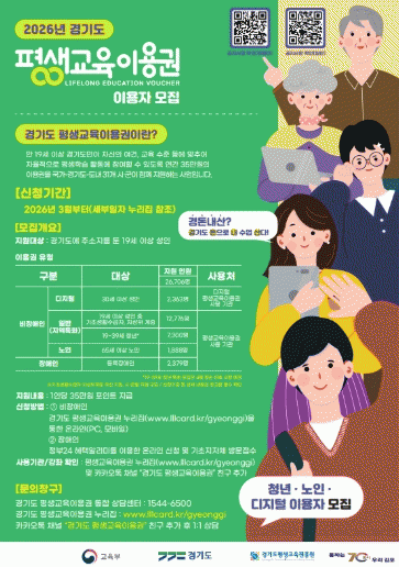 Áö¿ø À¯ÇüÀº ¡ãÀϹÝ(19¼¼ ÀÌ»ó Àú¼ÒµæÃþ) ¡ãÀå¾ÖÀÎ(19¼¼ ÀÌ»ó µî·ÏÀå¾ÖÀÎ) ¡ã³ëÀÎ(65¼¼ ÀÌ»ó) ¡ãµðÁöÅÐ ±³À° ¼ö¿äÀÚ(30¼¼ ÀÌ»ó)À̸ç, 500¿© ¸íÀÌ ¼±Á¤µÉ ¿¹Á¤ÀÌ´Ù. ¼±Á¤µÈ ´ë»óÀÚ¿¡°Ô´Â 1Àδç 35¸¸ ¿ø »ó´çÀÇ Æò»ý±³À°ÀÌ¿ë±ÇÀÌ Áö±ÞµÇ¸ç, Æò»ý±³À°ÀÌ¿ë±Ç ȨÆäÀÌÁö¿¡ µî·ÏµÈ ±â°üÀÇ °Á¸¦ ¼ö°ÇÒ ¼ö ÀÖ´Ù.