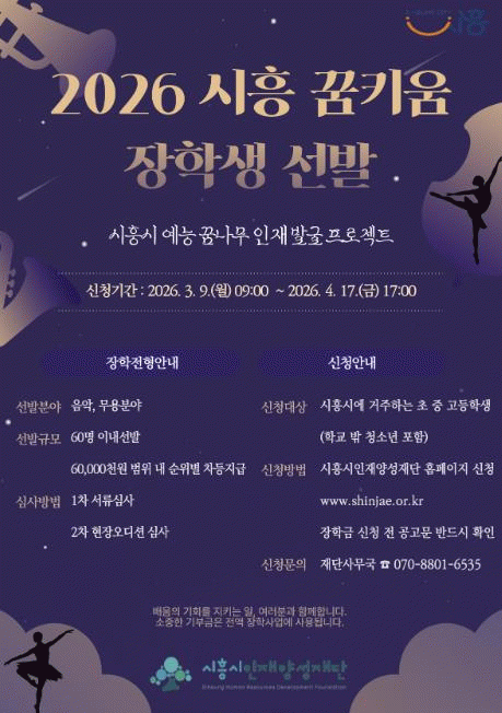 [NWS¹æ¼Û=Çѽ¸ñ ±âÀÚ]½ÃÈï½ÃÀÎÀç¾ç¼ºÀç´ÜÀº Áö¿ª ³» ¿¹´É ºÐ¾ß ÀÎÀ縦 ¹ß±¼¤ýÀ°¼ºÇϱâ À§ÇØ ¡®2026³â ½ÃÈï ²ÞŰ¿ò ÀåÇлý¡¯À» 60¸í À̳»·Î ¼±¹ßÇÑ´Ù.