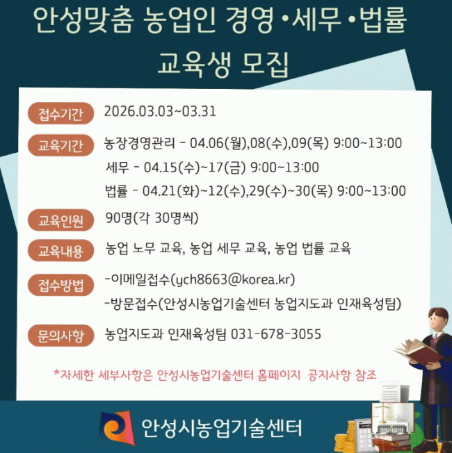 | ¾È¼º½Ã, '¾È¼º¸ÂÃã ³ó¾÷ÀÎ °æ¿µ¡¤¼¼¹«¡¤¹ý·ü ±³À°' ±³À°»ý ¸ðÁý! =Çѽ¸ñ ±âÀÚ |