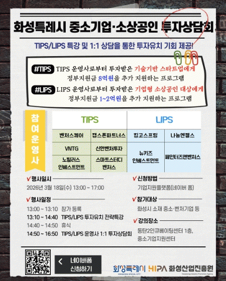 ¡®È¼ºÆ¯·Ê½Ã Áß¼Ò±â¾÷¡¤¼Ò»ó°øÀÎ ÅõÀÚ»ó´ãȸ¡¯´Â ȼº½Ã Áß¼Ò±â¾÷ ¹× ¼Ò»ó°øÀÎÀÇ ÅõÀÚÀ¯Ä¡ ¿ª·® °È¸¦ Áö¿øÇϱâ À§ÇØ ¸¶·ÃµÆÀ¸¸ç, TIPS(Tech Incubator Program for Startup) ¹× LIPS(Licorn Incubator Program for Small brand) ÇÁ·Î±×·¥À» Áß½ÉÀ¸·Î ¿î¿µµÈ´Ù.