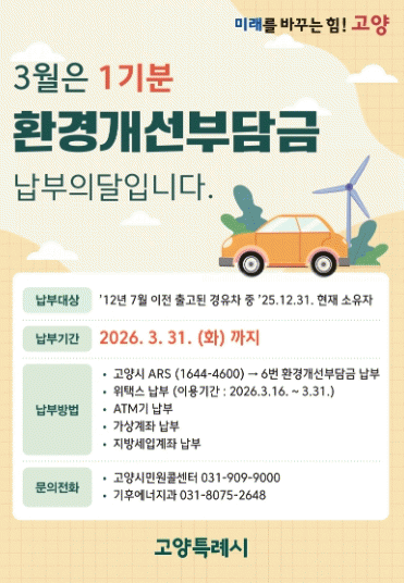 | °í¾ç½Ã, 3¿ùÀº ȯ°æ°³¼±ºÎ´ã±Ý ³³ºÎÀÇ ´Þ ³ëÈÄ °æÀ¯ Â÷·® ¼ÒÀ¯ÀÚ¿¡ Á¤±âºÐ ȯ°æ°³¼±ºÎ´ã±Ý ºÎ°ú =Çѽ¸ñ ±âÀÚ |