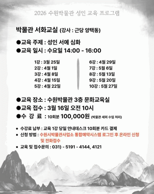 | ¼ö¿ø¹Ú¹°°ü, 2026³â »ó¹Ý±â ¼ºÀÎ ±³À° ÇÁ·Î±×·¥ ¼ö°»ý ¸ðÁý ¹Ú¹°°ü ¼È±³½Ç, ³ªÀÇ Ã¹ ͏®±×·¡ÇÇ ¿î¿µ =Çѽ¸ñ ±âÀÚ |