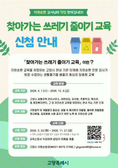 | °í¾ç½Ã, ¡®2026³â ã¾Æ°¡´Â ¾²·¹±â ÁÙÀ̱⠱³À°¡¯ ÃßÁø 4¿ù~12¿ù ±â°ü¡¤´Üü·Î ã¾Æ°¡´Â ¼ö¾÷¡¦ÀÚ¿ø Àý¾à Çʿ伺, ºÐ¸®¹èÃâ ¿ä·É µî ´Ù·ï =Çѽ¸ñ ±âÀÚ |