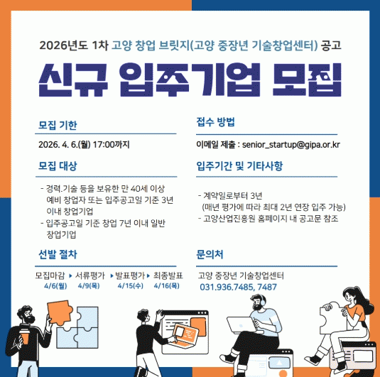 | °í¾ç»ê¾÷ÁøÈï¿ø, ¡®°í¾ç â¾÷ ºê¸´Áö(°í¾çÁßÀå³â±â¼úâ¾÷¼¾ÅÍ)¡¯ ½Å±Ô ÀÔÁÖ±â¾÷ ¸ðÁý ¸¸ 40¼¼ ÀÌ»ó ¿¹ºñâ¾÷ÀÚ¡¤Ã¢¾÷ 3³â À̳» ±â¾÷ ´ë»ó, 4¿ù 6ÀϱîÁö Á¢¼ö =ÇãÀº¼ ±âÀÚ |