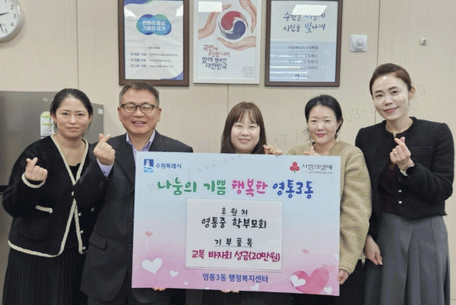 [NWS¹æ¼Û=Çѽ¸ñ ±âÀÚ]¿µÅ뱸 ¿µÅë3µ¿´Â Áö³­ 23ÀÏ ¿µÅëÁßÇб³ Çкθðȸ¿¡¼­ ±³º¹ ¹ÙÀÚȸ¸¦ ÅëÇØ ¸¶·ÃÇÑ ¼öÀͱÝÀ» °ü³» ¾î·Á¿î ÀÌ¿ôÀ» À§ÇØ ¿µÅë3µ¿ ÇàÁ¤º¹Áö¼¾ÅÍ¿¡ Àü´ÞÇß´Ù°í ¹àÇû´Ù.