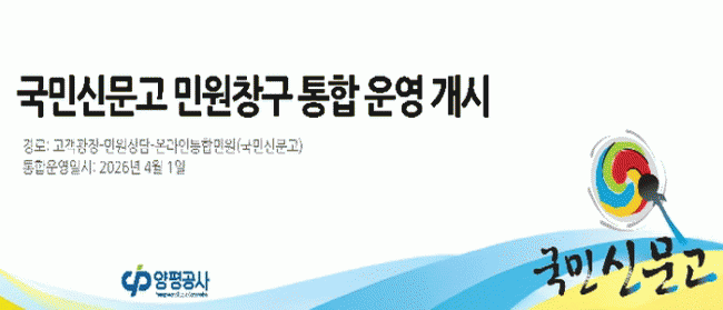 [NWS¹æ¼Û=Çѽ¸ñ ±âÀÚ]¾çÆò°ø»ç´Â ±º¹Î Áß½ÉÀÇ ¹Î¿ø ¼ºñ½º¸¦ °ÈÇÏ°í ¹Î¿ø ó¸®ÀÇ ½Å¼Ó¼º°ú È¿À²¼ºÀ» ³ôÀ̱â À§ÇØ ±¹¹Î±ÇÀÍÀ§¿øÈ¸°¡ ¿î¿µÇÏ´Â ¡®±¹¹Î½Å¹®°í¡¯ ½Ã½ºÅÛÀ» µµÀÔÇØ, 4¿ù 1ÀϺÎÅÍ Àü ½Ã¼³À» ´ë»óÀ¸·Î ÅëÇÕ ¹Î¿øÃ¢±¸ ¿î¿µÀ» Àü¸é ½ÃÇàÇÑ´Ù°í ¹àÇû´Ù.