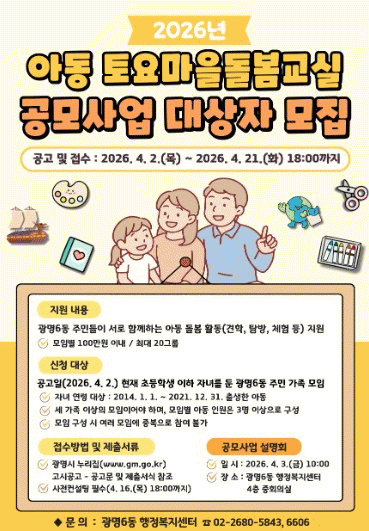 [NWS¹æ¼Û=Çѽ¸ñ ±âÀÚ]±¤¸í½Ã ±¤¸í6µ¿ ÇàÁ¤º¹Áö¼¾ÅÍ´Â ¿À´Â 21ÀϱîÁö ¡®2026³â ¾Æµ¿ Åä¿ä¸¶À»µ¹º½±³½Ç °ø¸ð»ç¾÷¡¯¿¡ Âü¿©ÇÒ ÁֹΠ°¡Á· ¸ðÀÓ 20°³ ÆÀÀ» ¸ðÁýÇÑ´Ù.