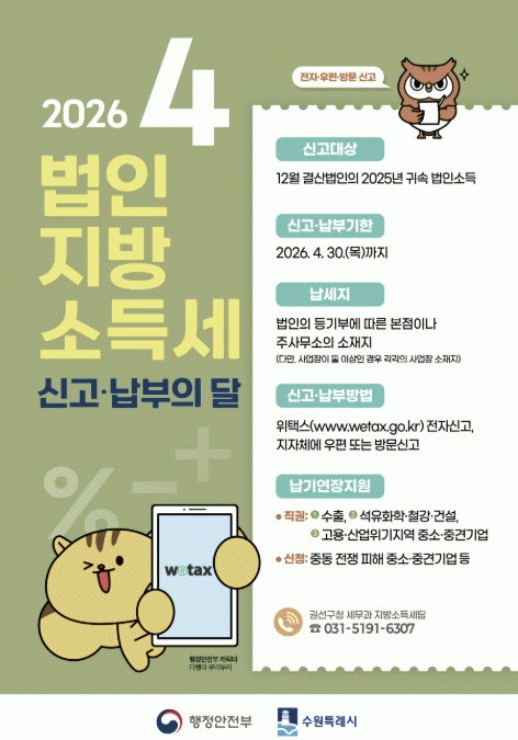 [NWS¹æ¼Û=Çѽ¸ñ ±âÀÚ]¼ö¿ø½Ã ±Ç¼±±¸´Â 4¿ù 30ÀϱîÁö °ü³»¿¡ »ç¾÷ÀåÀ» µÎ°í ÀÖ´Â ¹ýÀÎÀ» ´ë»óÀ¸·Î ¹ýÀÎÁö¹æ¼Òµæ¼¼ ½Å°í¡¤³³ºÎ ±â°£À» ¿î¿µÇÑ´Ù.