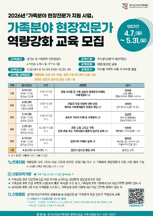 ¸ðÁý´ë»óÀº °æ±âµµ ³» °¡Á·ºÐ¾ß Àü¹®»ó´ã»çÀ̸ç, ±³À°Àº Â÷¼öº° 50¸í ³»¿Ü·Î ÃÑ 5Â÷¿¡ °ÉÃÄ ¿î¿µµÈ´Ù. ½Åû±â°£Àº 4¿ù 7ÀϺÎÅÍ 5¿ù 31ÀϱîÁöÀ̸ç, Àç´Ü ´©¸®ÁýÀ» ÅëÇØ Â÷¼öº°·Î ¼±Âø¼ø ¸ðÁýÇÑ´Ù.
