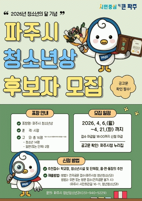 [NWS¹æ¼Û=Çѽ¸ñ ±âÀÚ]ÆÄÁֽô ŸÀÇ ¸ð¹üÀÌ µÇ´Â û¼Ò³â ¹× û¼Ò³âÁöµµÀÚ(¶Ç´Â ´Üü)¸¦ ¼±¹ß¡¤½Ã»óÇÏ´Â ¡®ÆÄÁֽà û¼Ò³â»ó¡¯Èĺ¸ÀÚ¸¦ ¿À´Â 4¿ù 21ÀϱîÁö Ãßõ¹Þ´Â´Ù.