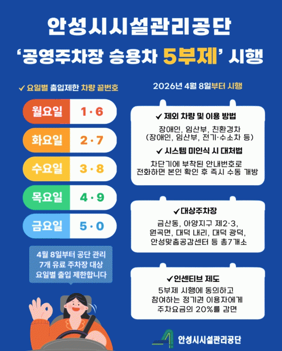 | ¾È¼º½Ã½Ã¼³°ü¸®°ø´Ü, ¿¡³ÊÁö À§±â ´ëÀÀ '°ø¿µÁÖÂ÷Àå ½Â¿ëÂ÷ 5ºÎÁ¦' ½ÃÇà 4¿ù 8ÀϺÎÅÍ °ø´Ü °ü¸® 7°³ À¯·á ÁÖÂ÷Àå ´ë»ó ¿äÀϺ° ÃâÀÔ Á¦ÇÑ =Çѽ¸ñ ±âÀÚ |