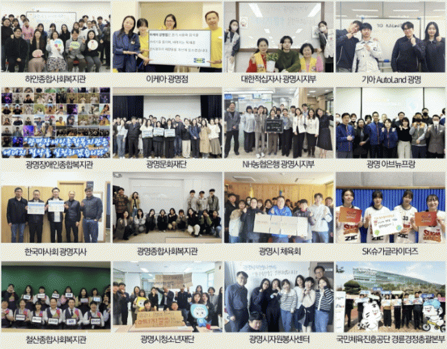 À̹ø ¼±¾ð¿¡´Â ±¤¸í½ÃÀÚ¿øºÀ»ç¼¾ÅÍ, ±¤¸í¹®ÈÀç´Ü, ±¤¸í½Ãû¼Ò³âÀç´Ü, ±¤¸í½ÃüÀ°È¸, ±¤¸íÁ¾ÇÕ»çȸº¹Áö°ü, ö»êÁ¾ÇÕ»çȸº¹Áö°ü, ÇϾÈÁ¾ÇÕ»çȸº¹Áö°ü, ±¤¸íÀå¾ÖÀÎÁ¾ÇÕº¹Áö°ü, Çѱ¹¸¶»çȸ ±¤¸íÁö»ç, ±¹¹ÎüÀ°ÁøÈï°ø´Ü °æ·û°æÁ¤ÃѰýº»ºÎ, ´ëÇÑÀû½ÊÀÚ»ç ±¤¸í½ÃÁöºÎ, ±¤¸í ¾Æºê´ºÇÁ¶û, ±â¾Æ ¿ÀÅä·£µå ±¤¸í, ÀÌÄÉ¾Æ ±¤¸íÁ¡, NH³óÇùÀºÇà ±¤¸í½ÃÁöºÎ, SK ½´°¡±Û¶óÀÌ´õÁî µî ÃÑ 16°³ ±â°üÀÌ Âü¿©Çß´Ù.