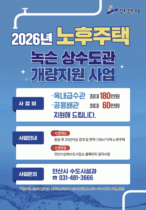 [NWS¹æ¼Û=Çѽ¸ñ ±âÀÚ]¾È»ê½Ã´Â ³ëÈÄÁÖÅà »ó¼öµµ°ü¿¡¼­ ¹ß»ýÇÒ ¼ö ÀÖ´Â ³ì¹°À» ¿¹¹æÇÏ°í ¾ÈÀüÇÏ°í ±ú²ýÇÑ ¼öµ¾¹°À» °ø±ÞÇϱâ À§ÇØ ¡®³ì¹° ¾ø´Â ¿ì¸® Áý ¼öµµ°ü °³·® Áö¿ø»ç¾÷¡¯À» ÃßÁøÇÑ´Ù°í 9ÀÏ ¹àÇû´Ù.