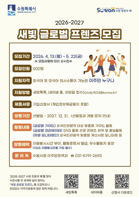 | ¼ö¿øÆ¯·Ê½Ã, '»õºû ±Û·Î¹ú ÇÁ·»Áî' 5¿ù 22ÀϱîÁö ¸ðÁý ¡®2026~2027 ¼ö¿ø ¹æ¹®ÀÇ ÇØ¡¯ ¸Â¾Æ ÀÌÁֹΠ100¸í ³»¿Ü ¼±¹ß¡¦±Û·Î¹ú °ü±¤ È«º¸ Ȱµ¿ Âü¿© =Çѽ¸ñ ±âÀÚ |