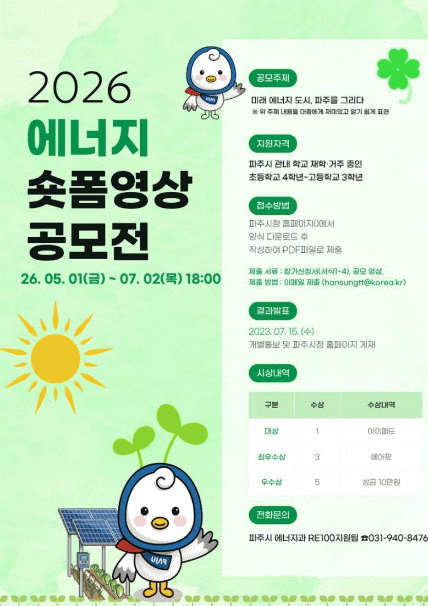 °ø¸ð ºÐ¾ß´Â ¡ãÆÄÁֽà °íÇâ»ç¶û±âºÎÁ¦ ƯÁ¤±âºÎ»ç¾÷ È«º¸(´ç½ÅÀÇ ±âºÎ, ÆÄÁÖ½ÃÀÇ Å¾çÀÌ µË´Ï´Ù) ¡ã2050³â ÆÄÁÖÀÇ ¹Ì·¡ ¸ð½À(Àç»ý¿¡³ÊÁö ±â¹Ý µµ½Ã»ó) ¡ãž籤 µî Àç»ý¿¡³ÊÁö Ȱ¿ë »ç·Ê ¹× È®»ê ¾ÆÀ̵ð¾î ¡ãģȯ°æ ±³Åë¼ö´Ü üÇè(Àç»ý¿¡³ÊÁö ±â¹Ý À̵¿¡¤ÃæÀü »ó»ó) µîÀ̸ç, ¡®¹Ò¡¯, À¯¸Ó, ÀÚ¸·, ÀΰøÁö´É µî ´Ù¾çÇÑ Ç¥Çö ¹æ½Äµµ Ȱ¿ëÇÒ ¼ö ÀÖ´Ù.