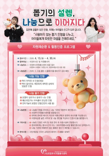 À̹ø Ȱµ¿Àº °¡Á¤¿¡¼­ »ç¿ëÇÏÁö ¾Ê´Â ÀÎÇüÀ» ¼ö°ÅÇØ Àç¼øÈ¯ÇÑ µÚ ¾Æµ¿½Ã¼³¿¡ Àü´ÞÇÏ´Â ÀÚ¿ø¼øÈ¯Çü ÇÁ·Î±×·¥À̸ç, Âü¿©ÀÚ´Â ³ª´® ±âÁØ¿¡ ¸Â´Â ÀÎÇüÀ» ÁغñÇØ ¼¾Å͸¦ ¹æ¹®Çϸé Á¢¼ö°¡ °¡´ÉÇÏ´Ù. À̸¦ °è±â·Î ÀÚ¿øÀç¼øÈ¯°ú Ȱµ¿ÀÎÁõÀ» ¿¬°èÇÏ¿© ÀÚ¿ø¼øÈ¯ Àνİú ³ª´® ¹®È­¸¦ È®»êÇϰí Áö¼Ó °¡´ÉÇÑ ÀÚ¿øºÀ»ç ±â¹ÝÀ» ¸¶·ÃÇϰíÀÚ ±âȹµÆ´Ù.