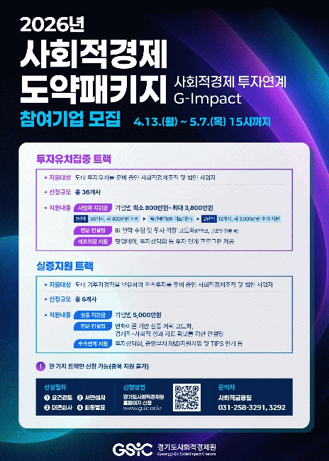 [NWS¹æ¼Û=Çѽ¸ñ ±âÀÚ]°æ±âµµ»çȸÀû°æÁ¦¿øÀÌ »çȸÀû°æÁ¦Á¶Á÷ÀÇ ÅõÀÚÀ¯Ä¡¸¦ Áö¿øÇϱâ À§ÇØ ¡®2026³â »çȸÀû°æÁ¦ µµ¾àÆÐŰÁö(»çȸÀû°æÁ¦ ÅõÀÚ¿¬°è G-Impact)¡¯ Âü¿©±â¾÷À» 5¿ù 7ÀÏ ¿ÀÈÄ 3½Ã±îÁö ¸ðÁýÇÑ´Ù.