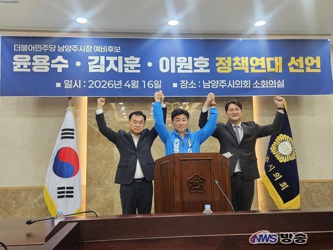 ÀÌ¿øÈ£¡¤À±¿ë¼ö¡¤±èÁöÈÆ ¼¼ È帴 16ÀÏ ³²¾çÁÖ½ÃÀÇȸ ¼ÒȸÀǽǿ¡¼ ±âÀÚȸ°ßÀ» ¿°í ³²¾çÁÖ ¹Ì·¡¸¦ À§ÇÑ Á¤Ã¥¿¬´ë¸¦ ¼±¾ðÇß´Ù. À̵éÀº »çÀûÀÎ ¾Æ½¬¿òÀ» µÚ·ÎÇÏ°í ³²¾çÁÖÀÇ È®½ÇÇÑ º¯È¿Í ¹ßÀüÀ̶ó´Â ´ëÀǸ¦ À§ÇØ ÀÌ¿øÈ£ È常¦ Áß½ÉÀ¸·Î ÈûÀ» ¸ðÀ¸±â·Î ÇÕÀÇÇß´Ù.