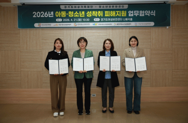 ´ëÀÀ´ÜÀº 21ÀÏ °æ±âµµ¿©¼ººñÀü¼¾ÅÍ¿¡¼ ºÎõ¡¤¼ö¿ø¡¤¾È¾ç¡¤¿ëÀΡ¤È¼º½Ã û¼Ò³â¼º¹®È¼¾ÅÍ¿Í ¡®¾Æµ¿¡¤Ã»¼Ò³â ¼ºÂøÃë ÇÇÇØÁö¿ø Çù·ÂÀ» À§ÇÑ ¾÷¹«Çù¾à¡¯À» ü°áÇß´Ù.