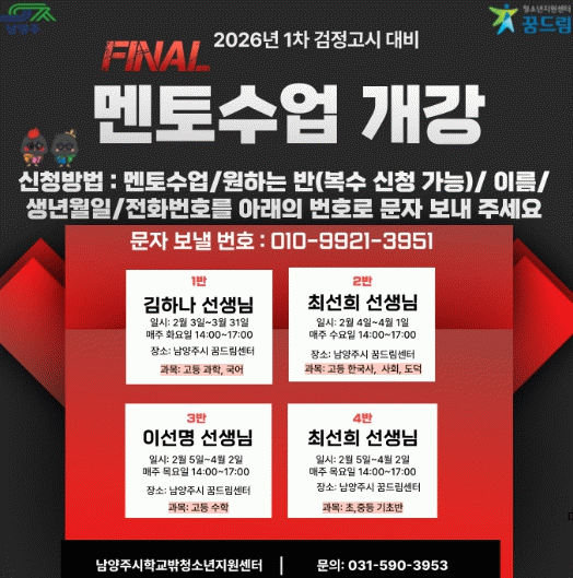 [NWS¹æ¼Û=Çѽ¸ñ ±âÀÚ]³²¾çÁֽô ¿À´Â 2¿ù 3ÀϺÎÅÍ ³²¾çÁÖ½ÃÇб³¹Ûû¼Ò³âÁö¿ø¼¾ÅÍ¿¡¼­ Çо÷À» Áß´ÜÇÑ Ã»¼Ò³âÀ» ´ë»óÀ¸·Î ¡®2026³âµµ Á¦1ȸ °ËÁ¤°í½Ã ´ëºñ ÇнÀ ¸àÅ丵 ÇÁ·Î±×·¥¡¯À» ¿î¿µÇÑ´Ù°í ¹àÇû´Ù. À̹ø ÇÁ·Î±×·¥Àº Çб³ ¹Û û¼Ò³â¡¦