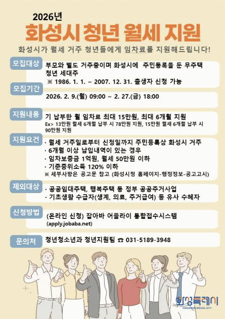 [»çȸ] È­¼ºÆ¯·Ê½Ã, û³â ¿ù¼¼ Áö¿ø »ç¾÷ ½ÅûÀÚ ¸ðÁý...»ó¹Ý±â 66¸í ¼±Á¤, ÃÖ´ë 90¸¸ ¿ø Áö¿ø |2026. 02.09