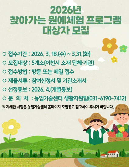 [»çȸ] ÀÌõ½Ã, 2026³â ã¾Æ°¡´Â µµ½Ã³ó¾÷ ¿ø¿¹Ã¼Çè ÇÁ·Î±×·¥ ´ë»óÀÚ ¸ðÁý |2026. 03.23