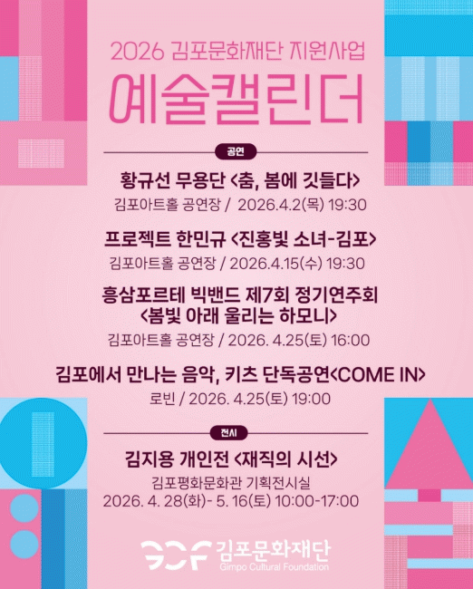 [NWS¹æ¼Û=Çѽ¸ñ ±âÀÚ](Àç)±èÆ÷¹®È­Àç´ÜÀº Áö¿ª ¿¹¼úÀÎÀÇ ¿¹¼úȰµ¿ ¹× âÀÛÀ» Áö¿øÇÏ´Â '2026³â ±èÆ÷¿¹¼úȰµ¿Áö¿ø»ç¾÷'°ú '°æ±â¿¹¼úȰµ¿Áö¿ø»ç¾÷ '¸ðµç¿¹¼ú31'' ÃÖÁ¾ ¼±Á¤ °á°ú, ÃÑ 74°ÇÀÇ ´Ù¾çÇÑ ¿¹¼úȰµ¿ÀÌ ±èÆ÷ Àü¿ª¿¡¼­ ÆîÃÄÁø´Ù°í ¹à¡¦